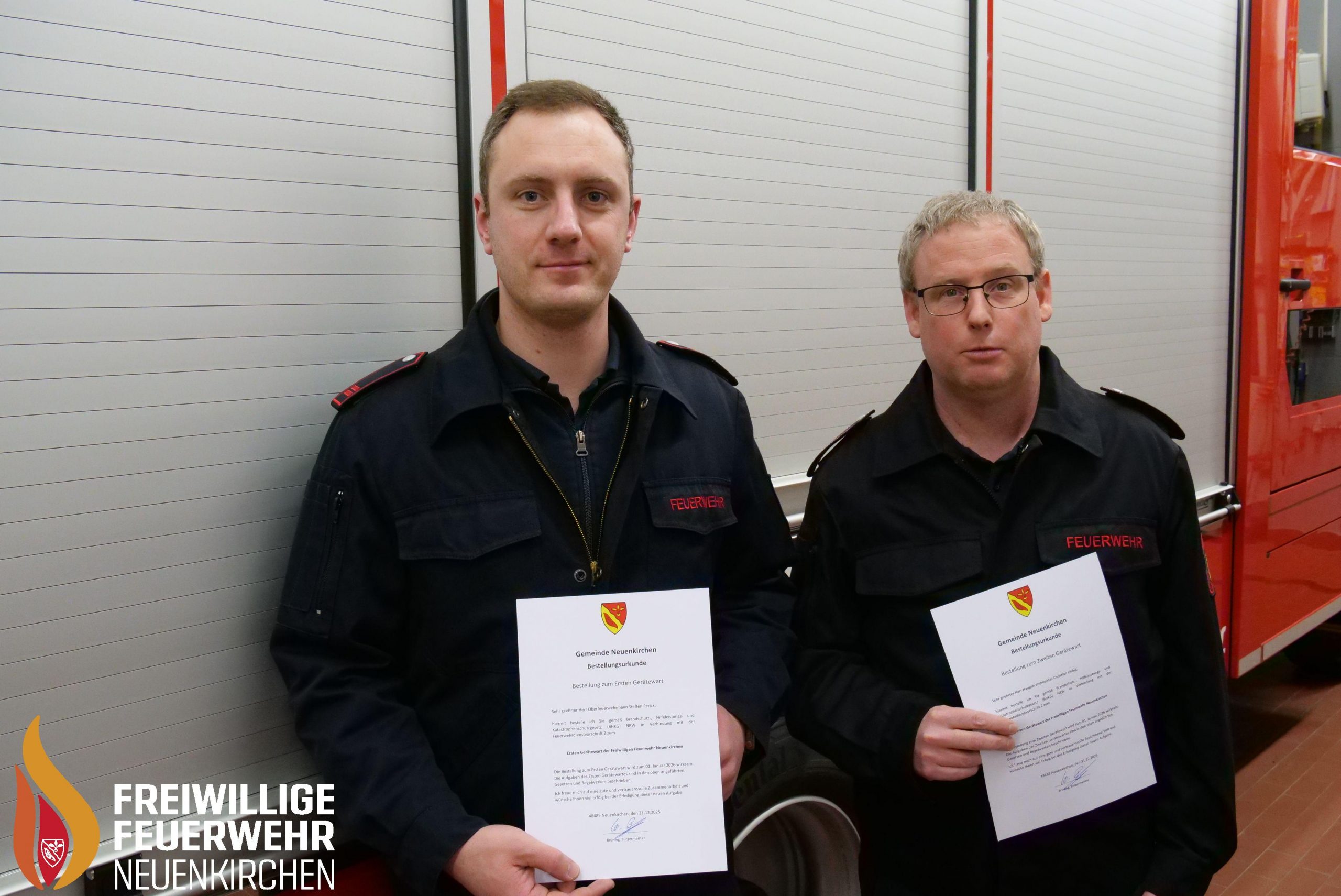 Bereits seit Juni 2025 hat die Freiwillige Feuerwehr Neuenkirchen mit Steffen Perick einen hauptamtlichen Gerätewart. Dieser hat nun, nach bestandenem Gerätewart-Lehrgang, auch das Amt des ersten Gerätewartes inne. Christian Liebig, der das Amt zuvor im Ehrenamt ausgeübt hat, wird Steffen weiterhin als zweiten Gerätewart unterstützen.
