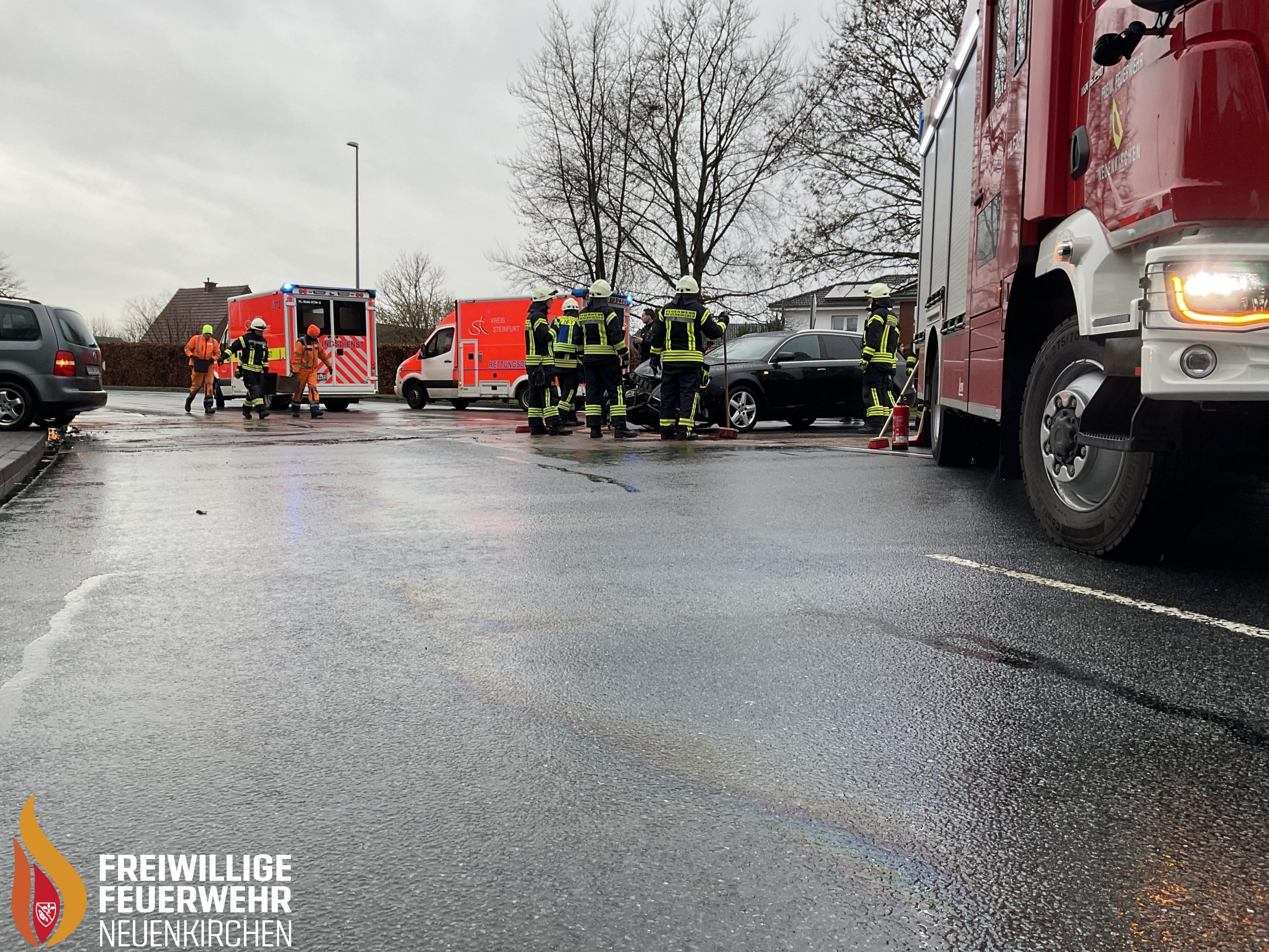 Zu einer technischen Hilfeleistung im Kreuzungsbereich von Eilersweg und Westfalenring wurde die Tagesalarmgruppe der Feuerwehr Neuenkirchen am Freitagmorgen um kurz vor elf Uhr alarmiert. Vor Ort war es zu einem Verkehrsunfall mit zwei beteiligten PKW gekommen. Die Feuerwehr sicherte die Unfallstelle, klemmte die Batterien der verunfallten Fahrzeuge ab und nahm auslaufende Betriebsstoffe der Fahrzeuge auf. Nach Abschluss der Arbeiten nach ca. einer Stunde wurde die Einsatzstelle an die Polizei und den Straßenbaulastträger übergeben, welcher anschließend die Straße von Bindemittel und Trümmerteilen reinigte.